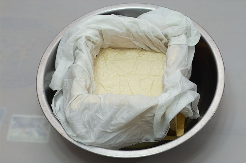 將木蓋蓋上豆腐,準備翻面取下濾巾.