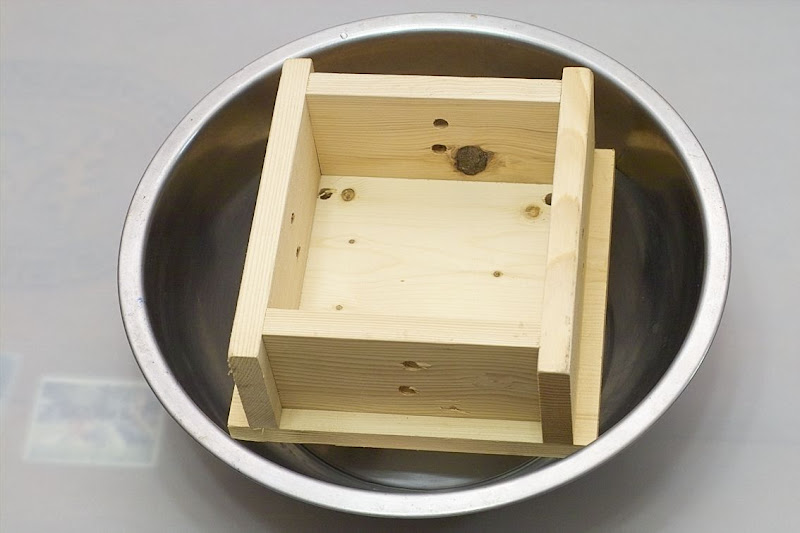 用雙手將木蓋擠壓出水,並在木蓋上方放置重物壓出水份.